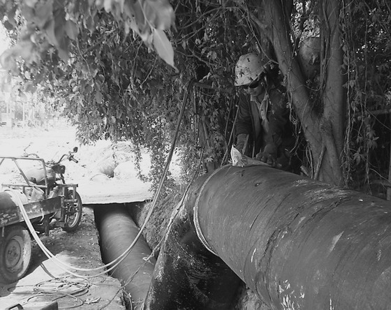昨日下午,記者在油城三路實華加油站附近路段看到,施工人員正在對新裝設的給水管道進行焊接、整飾等工作,粗大的管道大部分埋在地下,有小部分露出地面,頗有氣勢。